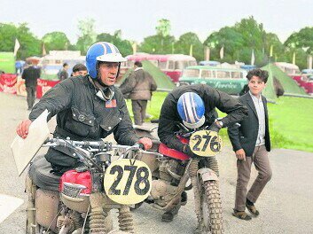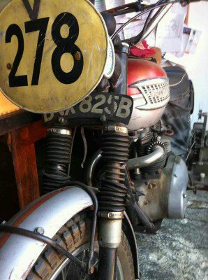 Photo of USA Team Triumph Riders #278 – Steve McQueen and #276 – Cliff Coleman at the International Six Day Trials. Usually this event is seen in black and white but these images in living Kodachrome give this a vigor that feels younger than the half century of time passed. The Triumph Trophy #278 itself is at Johnson Motors in California.