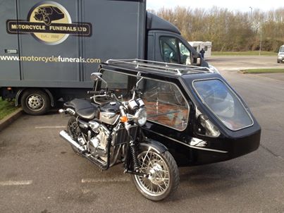 What better way for the conveyance of a casket for a motorcyclist that a hearse combination. Motorcycle Funerals have just that outfit with glass surrounded car being driven along by a appropriate 900cc Triumph Adventurer.