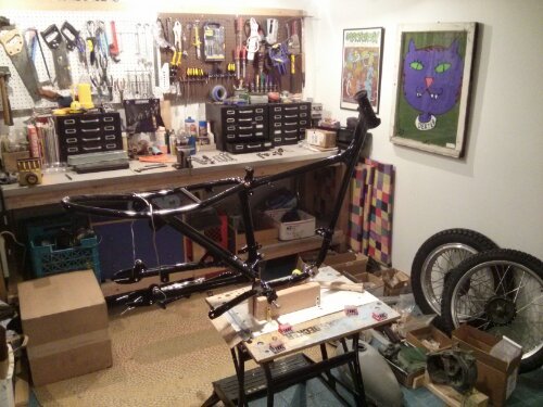 Okay! Bolting parts of the frame together. A little bit of a dry-run a some new nuts and washers are required. But taking shape nonetheless. A lot more straight forward than the Bonnie. Also a better workshop and tool setup helps too!