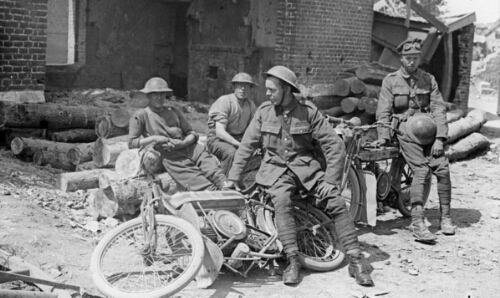On the eve of the 70th anniversary if the D-Day landings in Normandy here is an image from a war before that one. Some weary lads sit in the sun with their Douglas 2 3/4 WW1 motorcycles. Rubble and derelict buildings as backdrop, and I’m sure unforgettable memories on their minds. Were at the centennial of the Great War… A conflict to end all wars.. Alas not.