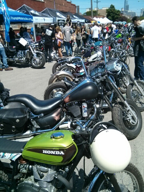 Mods versus Rockers no longer; it’s called Motoblot. A dedicated closed street location on the west side with plenty of bikes and loud music. Sunny weather with a cooling breeze drifting in off the lake.