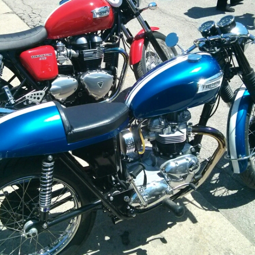 A new Thruxton in racing red sits aside a blazing blue sixties repli-Thruxton. Eeny meeny miney mo!