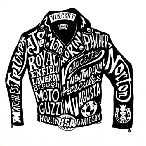A screen print poster sold at Motoblot: the creases of a Lewis Leathers jacket hold the classic bike names from the golden age of motorcycling. Lewis are the riders protection of choice that improve with age and mileage: especially in the temperate damp airs of Britain.