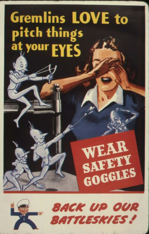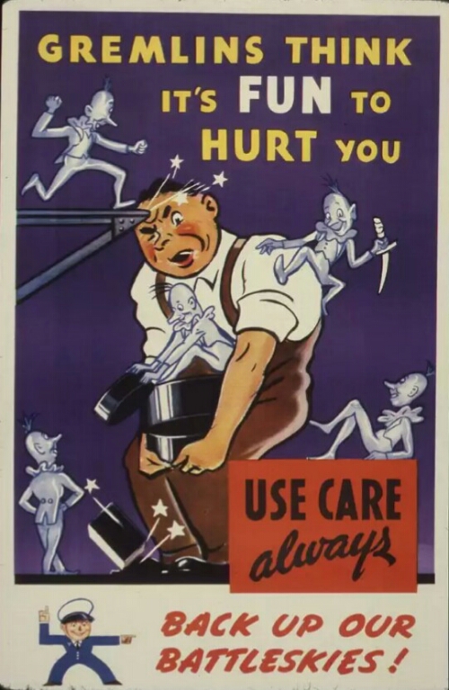 During world war 2 war machine production was ramped up to such a huge degree even today I can’t believe how they did it. To keep the home front workers productive a series of posters was prepared to hang in the factories promoting good work practices. Our little friend the gremlin was used to good effect ensuring safe practices on the factory floor.
