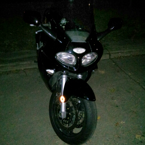 I went to feed a friends cats this evening. One the way there a pair of feline eyes gleamed out of the dark. Close up the muscular outlines of a Triumph Sprint peered back at me. Nice form. Even black colored. In the dark.