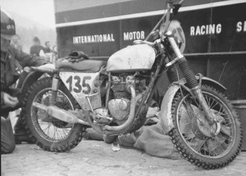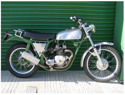 Dick Sutton’s Cheney framed Triumph as it currently looks. There are very particular details noted for off-road use: inboard pipes, high muffler, rearset pegs, easy access to ignition innards, alloy ‘tins’, thick seat, & Eric Cheney fettled suspension. The green frame and raw tank look stunning.
