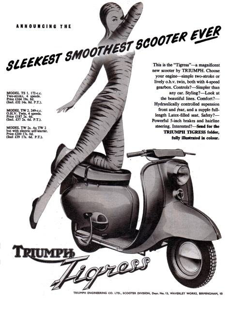 Triumph had the big papa Tiger T110 650cc desert king, the scooter Tigress, and the wee Cub. The fifties sure had a lit of fun on two wheels.