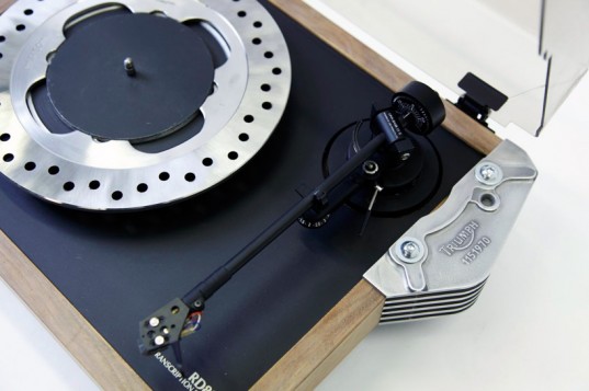 The disc brake as table is inspired. But I’d lay a velvet bed down first.