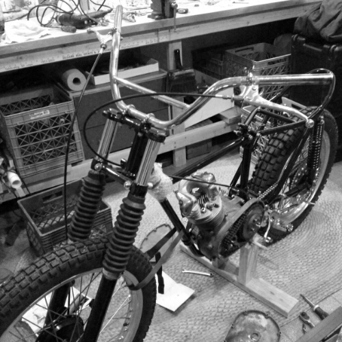 Got the engine firmly bolted in. Oil return lines attached and starting to get the clutch adjusted – missing a ball bearing that seats between the push rod and lever. Made a simple support stand so I can shuffle it around easily. Will need to amass some stainless fastenings for the oil tank, fenders and other ancillaries.