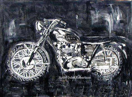 Large scale canvas: a near lifesize painting of a Triumph Bonneville by artist John Robertson. (As the watermark says).