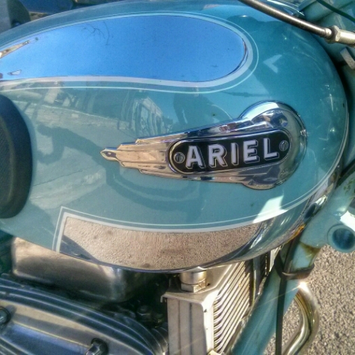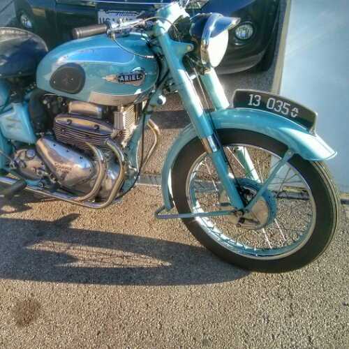 Blue-Sky beauty: I spied a glorious Ariel motorcycle whilst passing through Evanston earlier today. The glossy light blue color-scheme glinted in the corner of my vision.