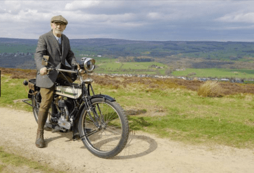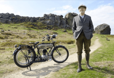 Noel Whittall, 77, a writer and motorcyclist from Rawdon, England, on his 1918 Triumph Model H near the Cow & Calf at Ilkley. His period tweeds: jacket plus-fours and flat cap, are a perfect Yorkshire outfit for a ramble on’t moor. His nearly century old machine would transport you lazily from Leeds along the A65 through Otley and on to Skipton wi’ Wart on t’Wharfe peering down from across dale.