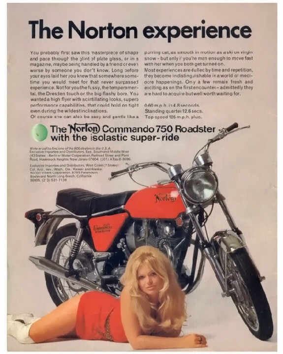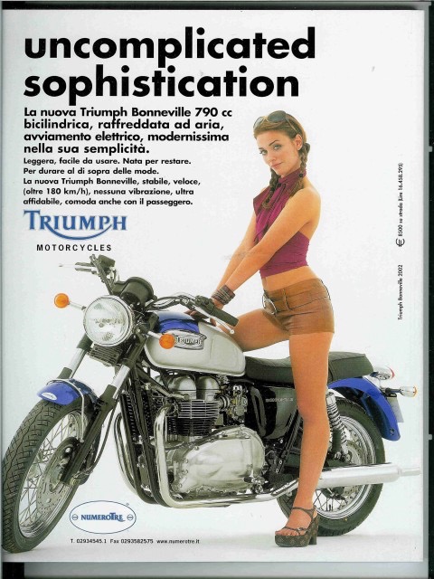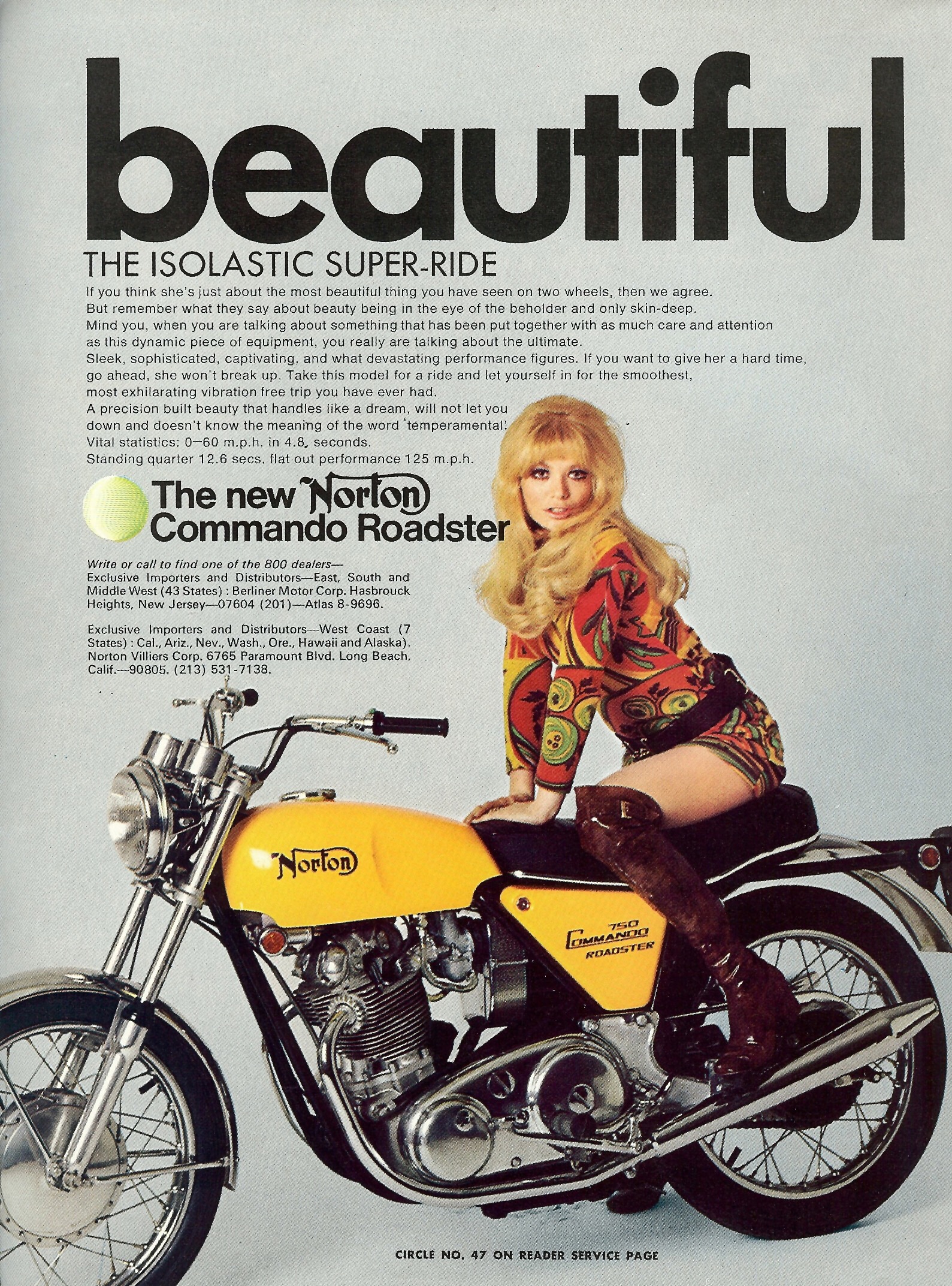 A latter-day Bonneville advert utilizes a time-worn approach for marketing to men: a young scantily clad lass draped over the latest and greatest. Well it ain’t new and is practically identical with the timeless Norton spreads of yesteryear.