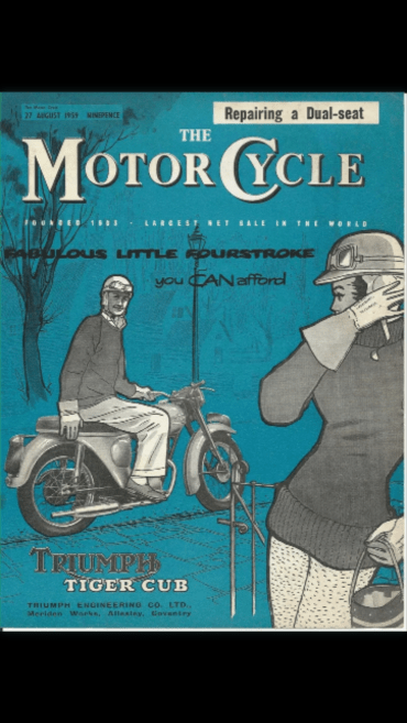 Triumph Cub is the little ride and was a popular little scoot-about back in the Fifties. It looks like a cosy mode two-up. “Honey, get your own ride!”.
