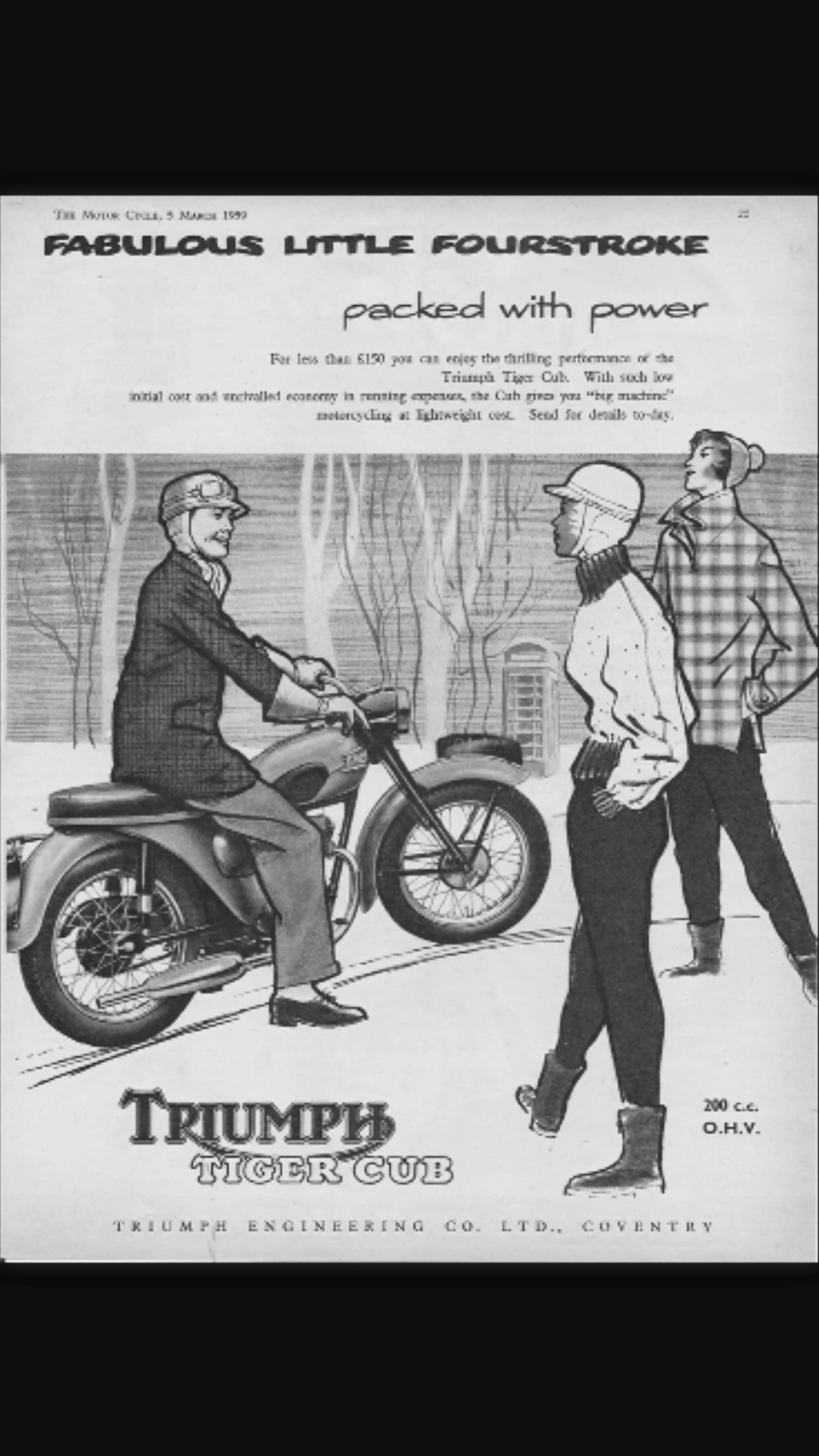 ive seen inside one of these little 200cc ‘gins and if the power is packed it must be quite a dense proposition in the watch-like internals. There ain’t much room! Unless you can miniaturize the little ponies hidden in there. Quite a snappy checked smock our friend is parading: and a bobble hat to top it off. The heavy submariners sweater on the behelmeted gal says she’s up for a spin next…
