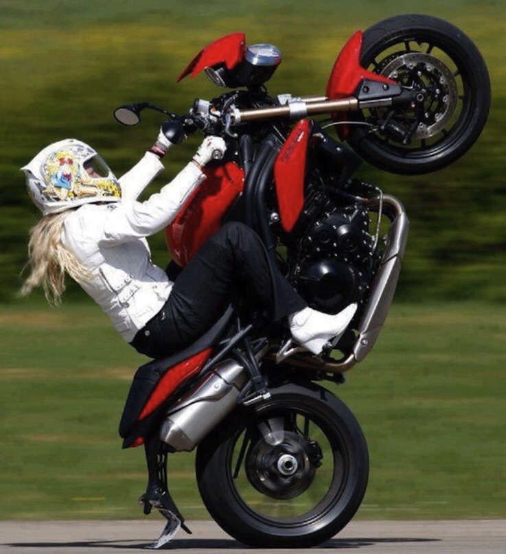 Mai Lin pulls a mean wheelie on a Triumph Speed Triple. White leathers and white high heels. Hair flying and one wheel spinning. The red bike closes the deal!