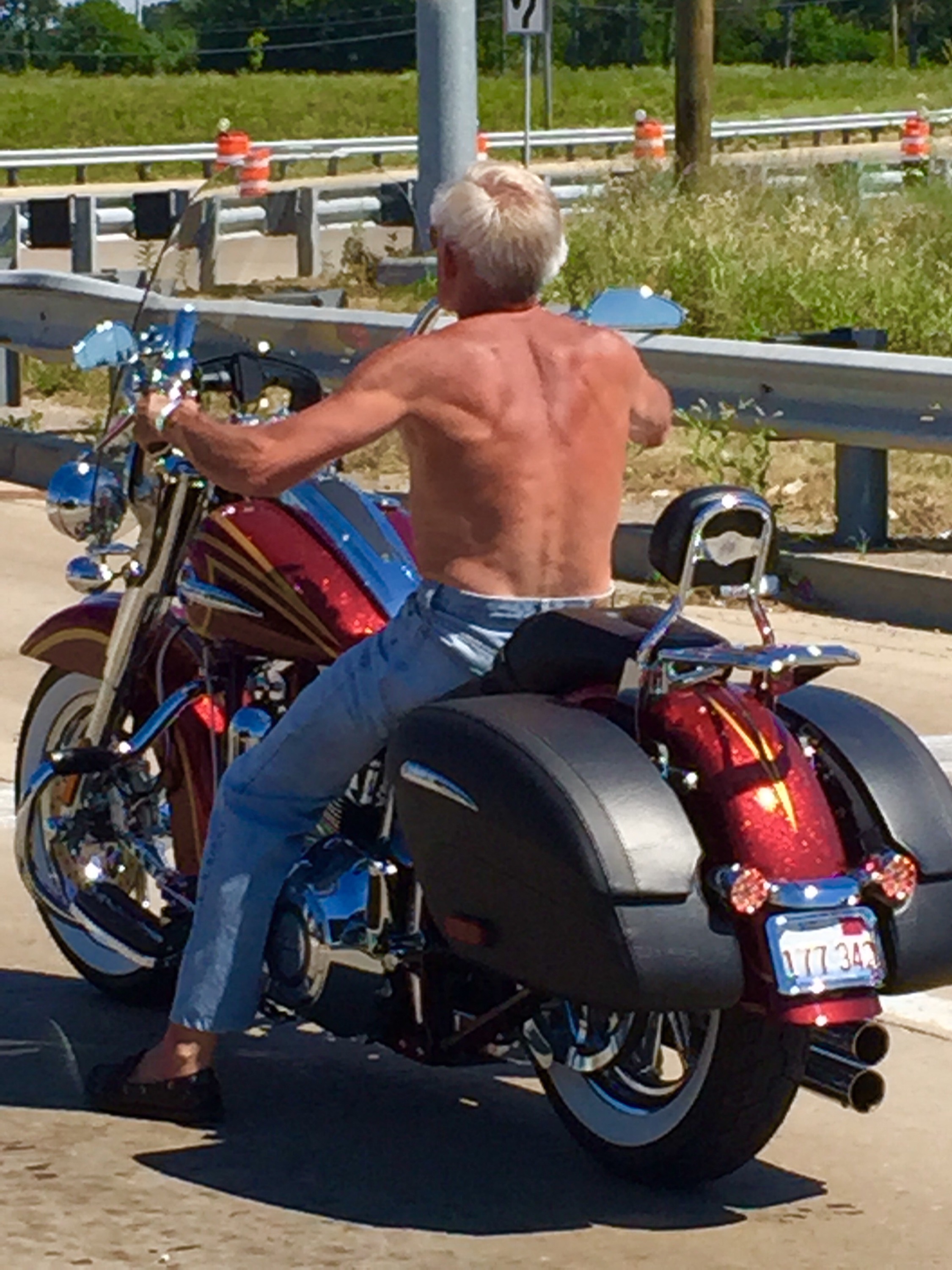 Hot day today. Low nineties. Out and about and saw this dude. He’s decided to keep cool on his mighty ruby slipper red hog: breeze across his shoulders sure must feel good. Well if ye dinnae want te wear a leather jacket in the midday sun…. Just grow yer own! Those wee moc loafers suit his attire too…