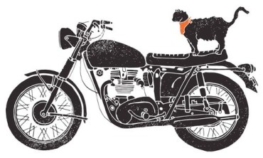Purr-fect! Ink print of Bonneville with le Chat Noir perched on pillion. Good graphic shape work to define the machine as well as the slinky feline passenger.