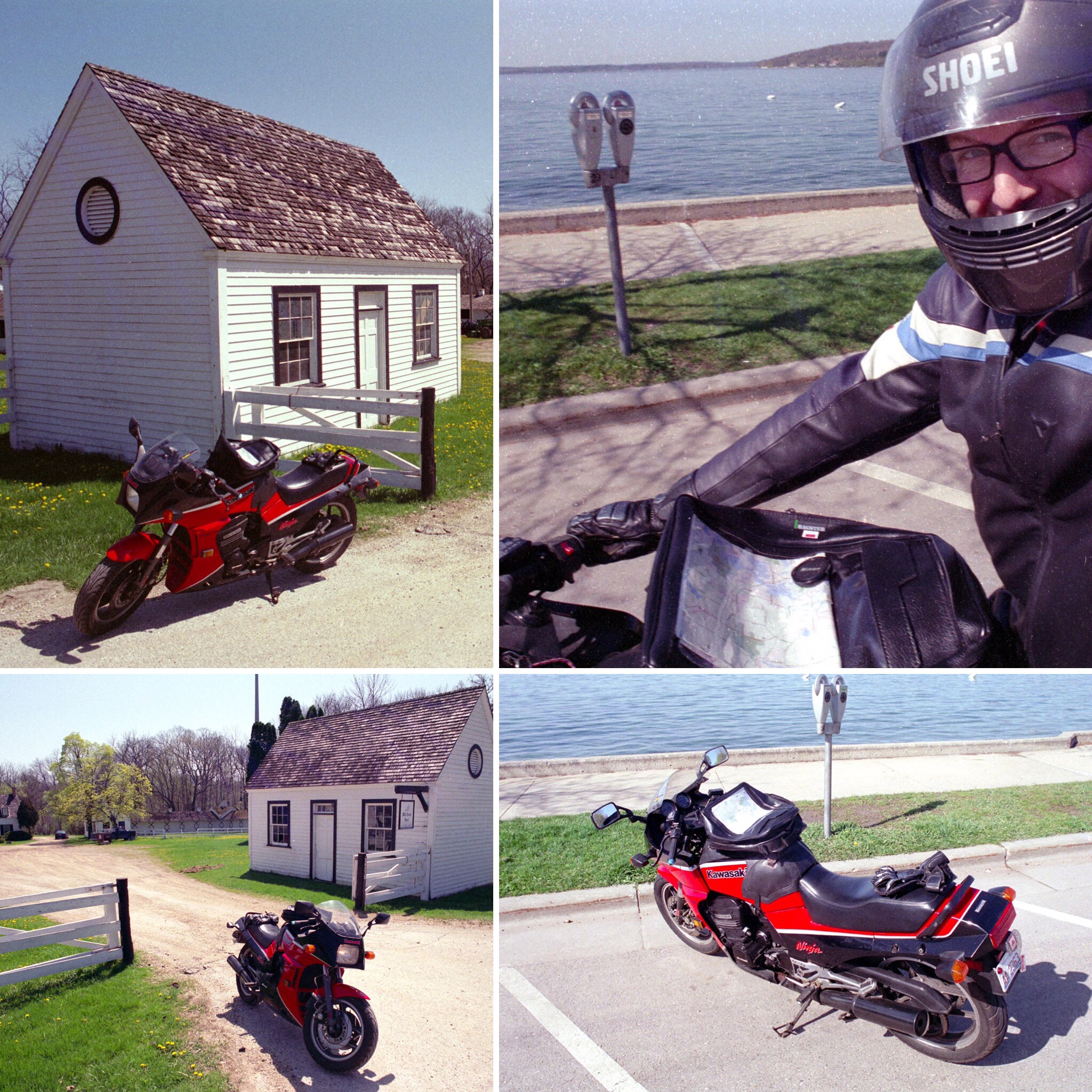 Here’s me enjoying a spring ride back in ’05 on my Twenty year old Ninja. The now classic Kawasaki ZX900 in Top Gun colors. A jaunt up to and around Lake Geneva was my favorite hare. The photos are taken on a sturdy and trusty Nikon F3. Darned good camera and a darnder good Moto too!