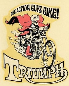 …riding a ‘Bone’ ville! A chopper from hell with a laughing ghoulish rider. The Egyptian Serif’d font of the Triumph logo is a great touch hinting a a sixties custom shop quality. The semi-psychedelic poster font header reinforces it.