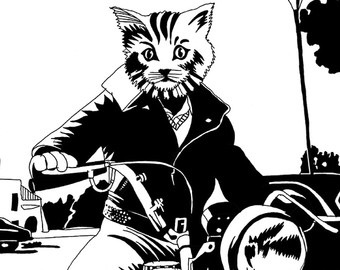 The creation of Paul Sample this leather clad bike has been around since ’72 drawn in a Robert Crumb-like inkmanship. Always little details to discover on a second or third reading.
