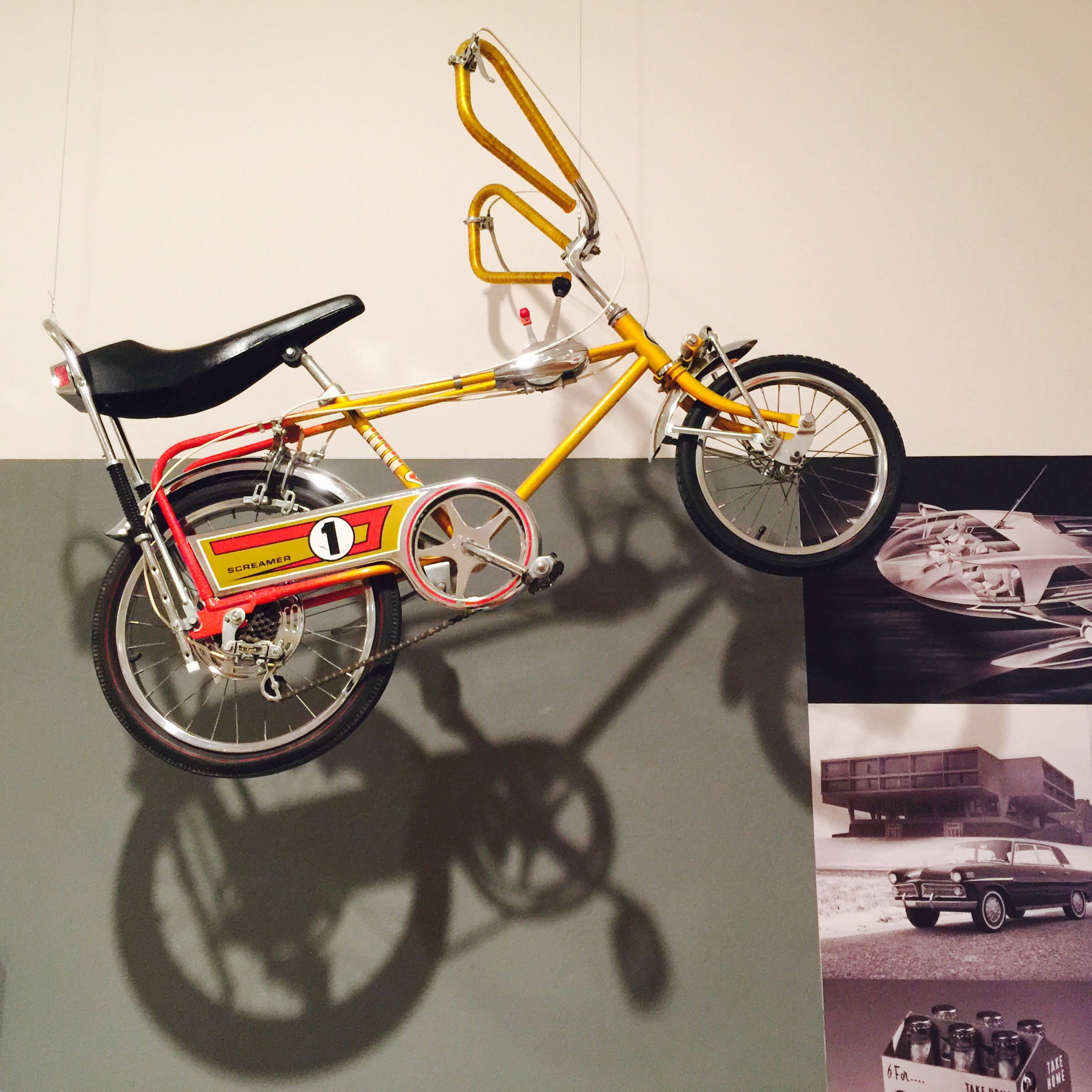 The Rebel Yell! We had a day trip to Milwaukee today, where the Museum of Art has been reorganized with a new layout for their modern collection. I spied this cracking bicycle devised by Wisconsin industrial designer Brook Stevens. A basic trailing arm front suspension, double rear wheel caliper brakes, stick gear shifter, comfy banana seat, and a noodle of a shape to the handlebars.