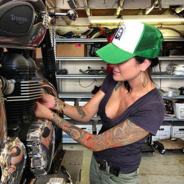 Bonnie ‘n’ Ink – sometimes I wish I had smaller hands to reach into the nooks and crannies found on typical motorcycle engineering. This lucky lass has both a nice table elevating maintenance proceedings as well as the deft feminine digits to perform that work. A bike work table is the next thing on my list of projects.