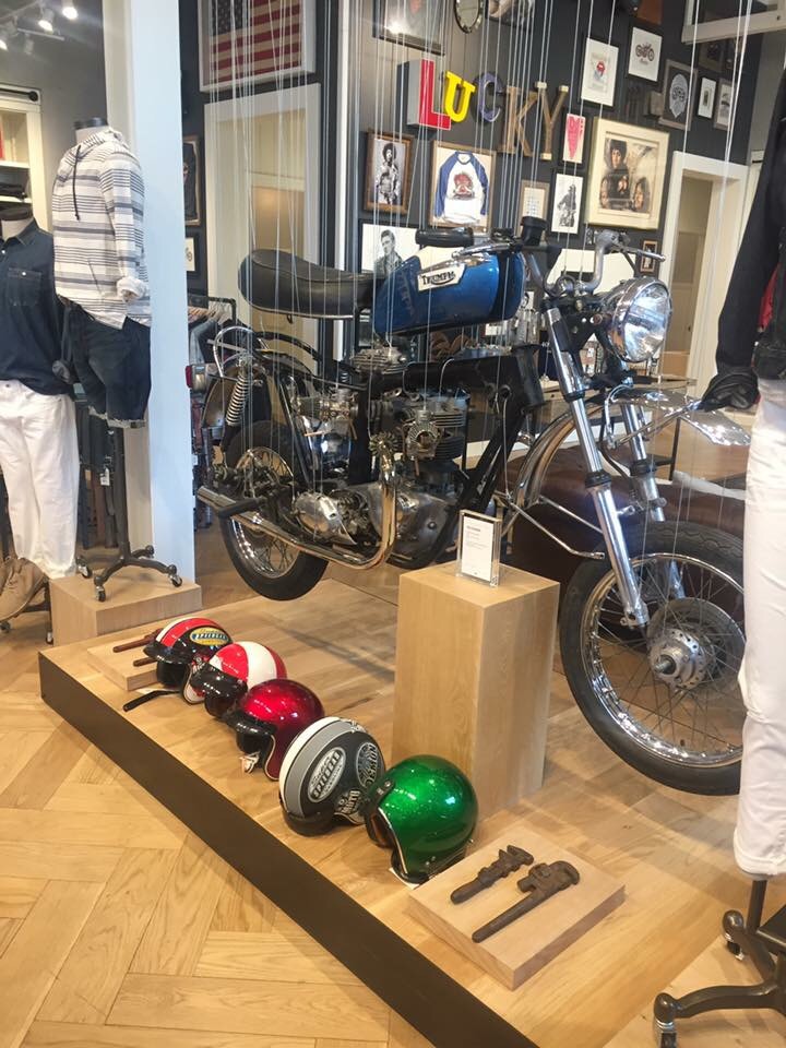 Lucky Brand jeans – the store in Las Vegas has an interesting suspended feature: a disassembled Triumph Bonneville. A mid seventies OIF model in semi-exploded repose. The brand also sells Triumph graphic tee-shirts so this hanging display is right at home.
