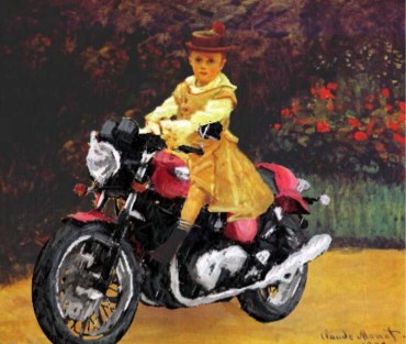 Girl on a Moto – by Claude Monet. Discovered in a dusty store room behind the artists house at Giverny. Le Thruxton Rouge is the title written on the back…