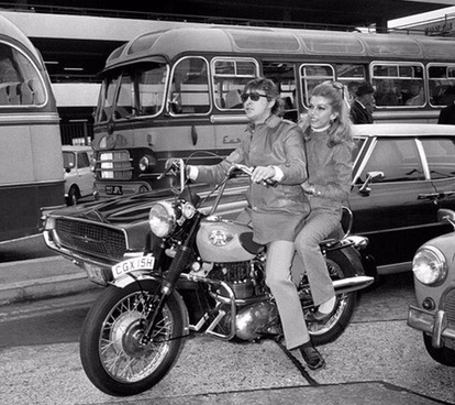 Boots made for Riding – record producer Mickie Most takes singer Nancy Sinatra on his BSA Shooting Star. Aptly named single the registration on the number plate signifies a’69 or ’70 model. She was in London to record The Highway Song.