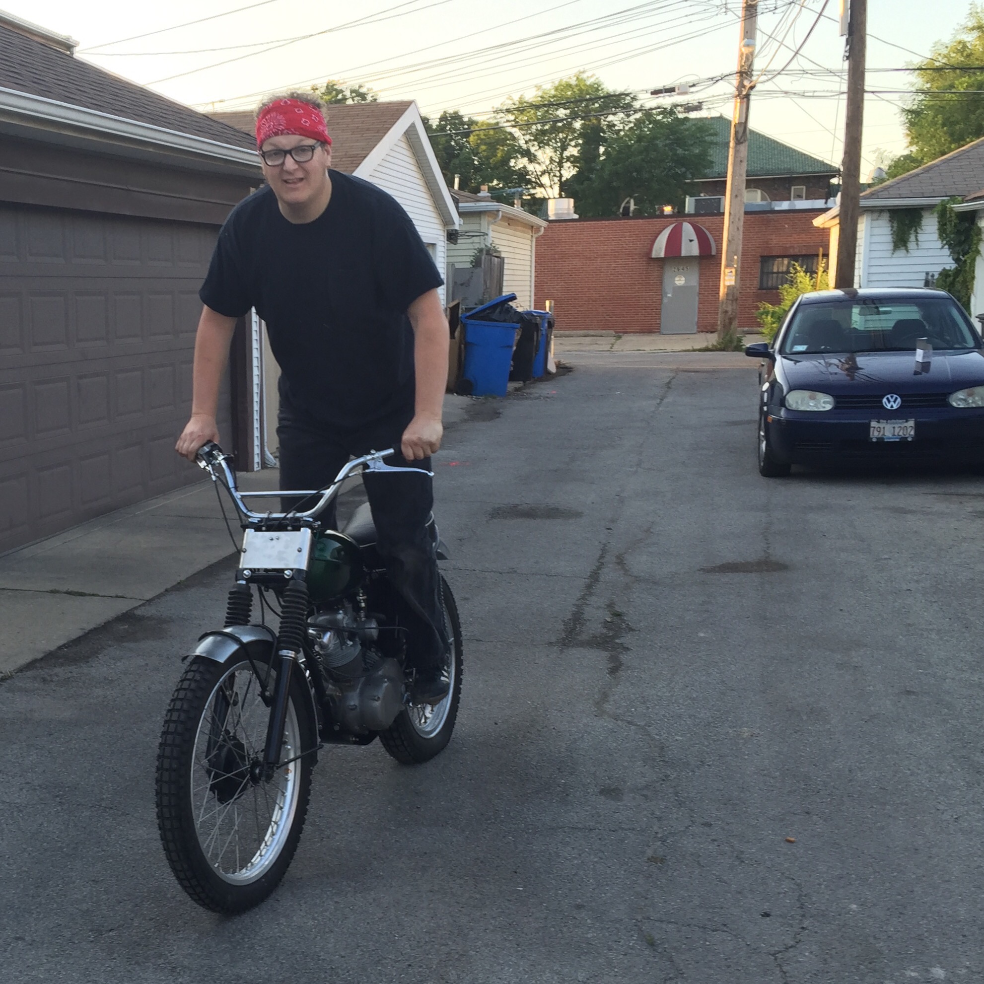 The Moggy – Tiger Cub takes her first tentative, and loud, paces along a Chicago alley. Rough engine but the gearbox shifted smartly up and down a couple of gears, clutch action light. Who says we can’t start having fun with this bike?