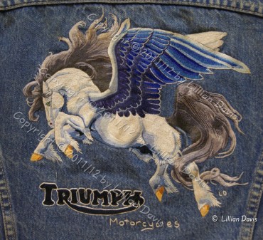 Pegasus – the flying horse. A beautifully embroidered denim jacket by a fine handed needlesmith Lillian Davis. Apparently she had this painted on her Triumpg petrol tank too.