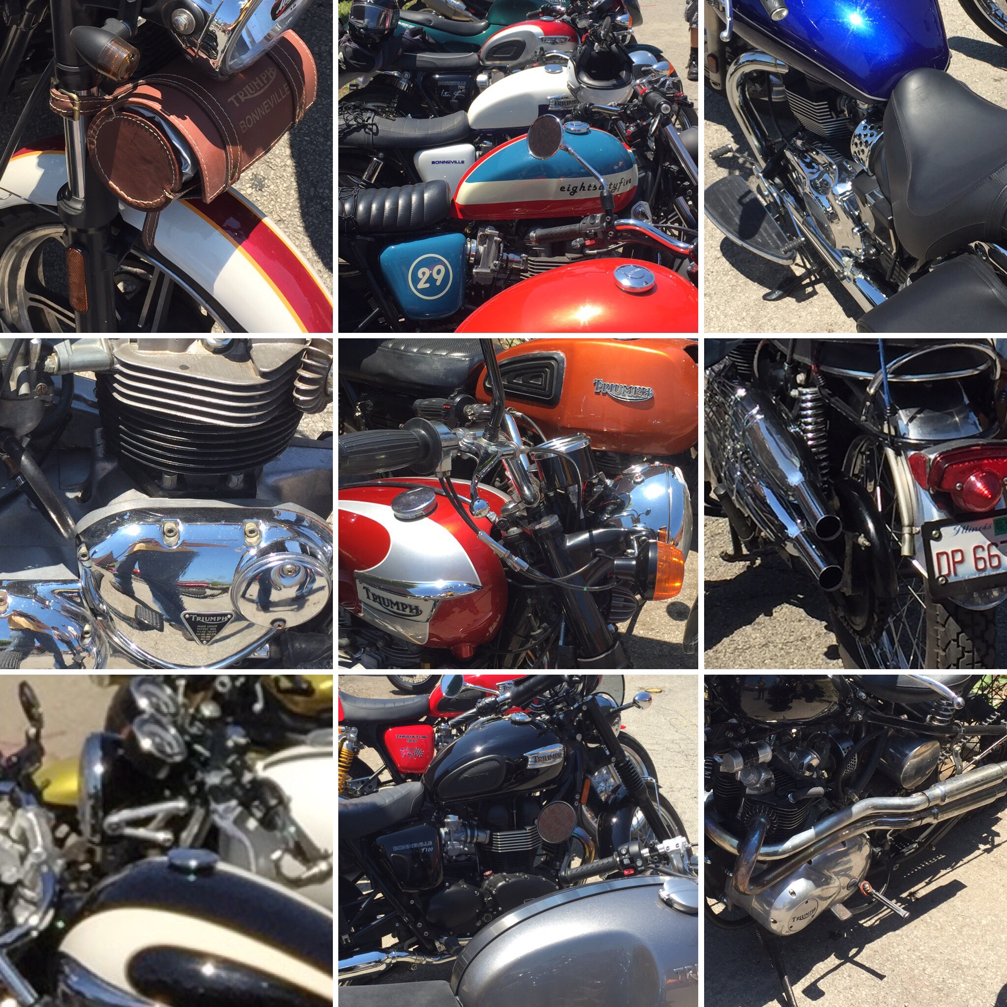 Three by Three: a grid of Triumph vignettes from the recent Motoblot show. Old and new, fast and slow, chrome and color. Just love looking at the details