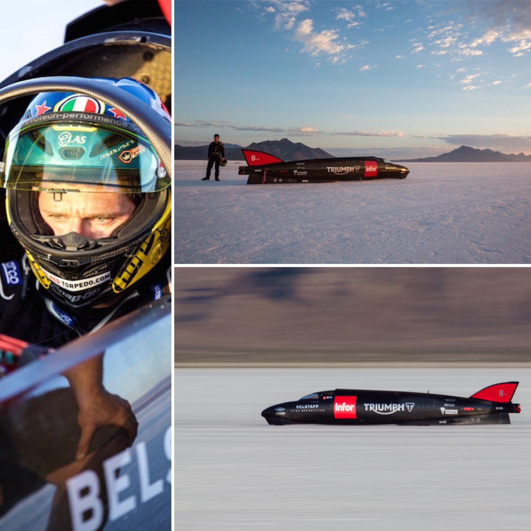 Utah – The Kirmington Kid adds a pinch of salt to his deeds of speedy derring do. He’s piloting a 1000bhp twin Rocket 3 engined sliver of a motorcycle across the famous Bonneville flats to get the streamlined two-wheeled record. Working up to a velocity north of the current 376mph record he took the carbon fiber sheathed cycle to 274mph in testing this week. A Triumph record!