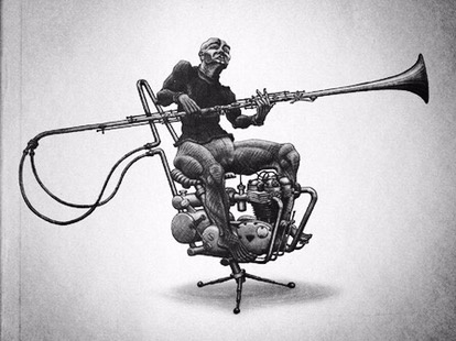 Blow your own Trumpet – an illustrators version of some internal combustion instrument. Taking the exhaust via sissy-bar piping to a flute-like horn. Kiwi artist is Kelvin Mann who creates a kind of Heath Robinson quirk.