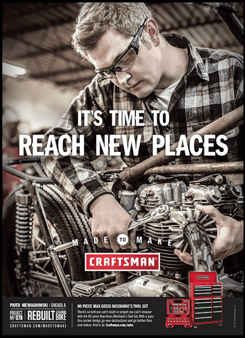 My buddy Dean saw this sales card in a Sears store where the automotive tools were. Craftsman ratchet and spark plug socket being put to good use on a bobber Triumph. The image is used in a number of advertising guises.