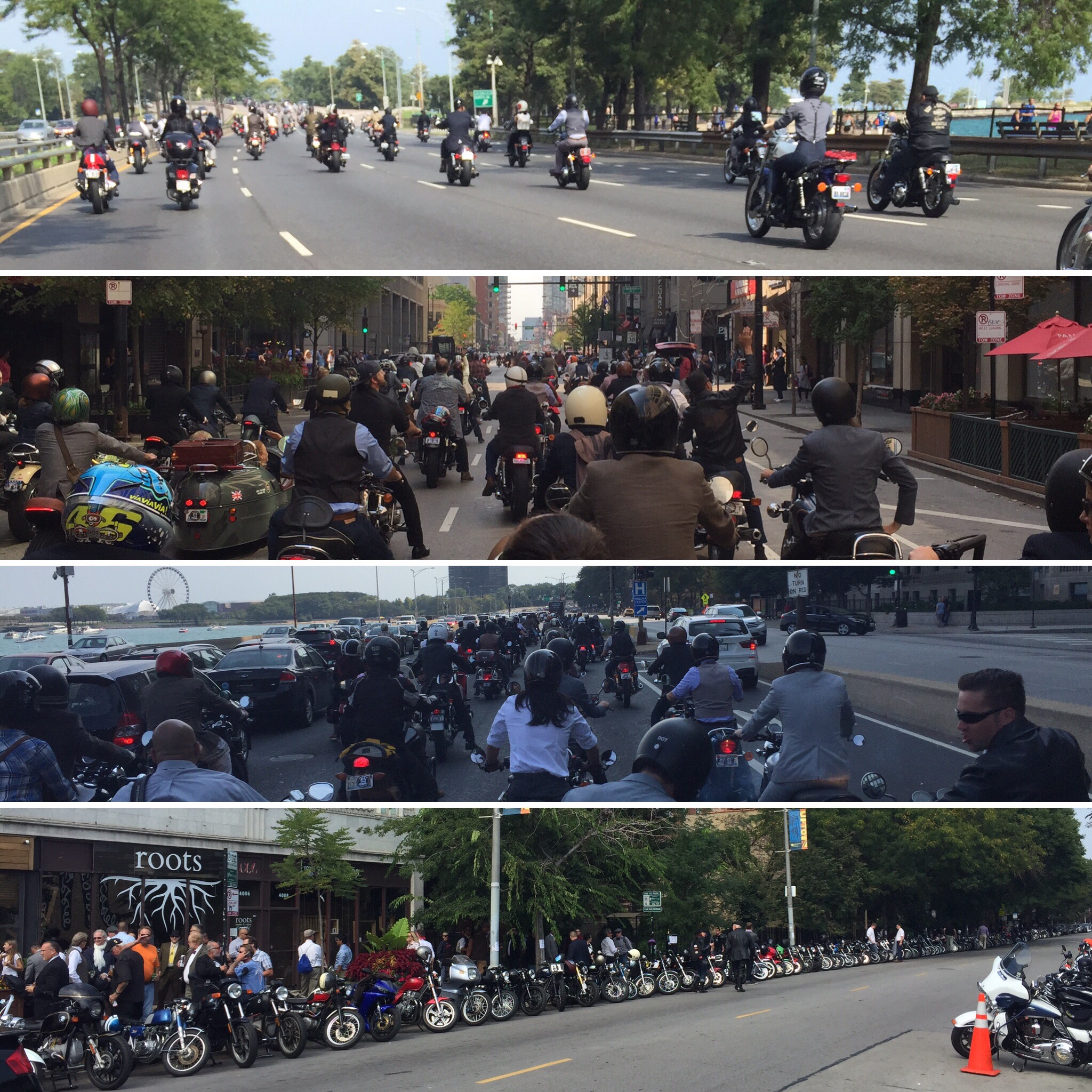 Dapper – a great turn-out for the Chicago DGR on a warm September Sunday. Lots a great bikes with riders and many pillion dressed to the nines as a convoy of over three hundred went through The Loop, along Lake Shore Drive, had a quick stop at Holiday Club and back to the Cobra Lounge. My garb was overalls, shirt and tie, black Doc Martin brogues and white socks.