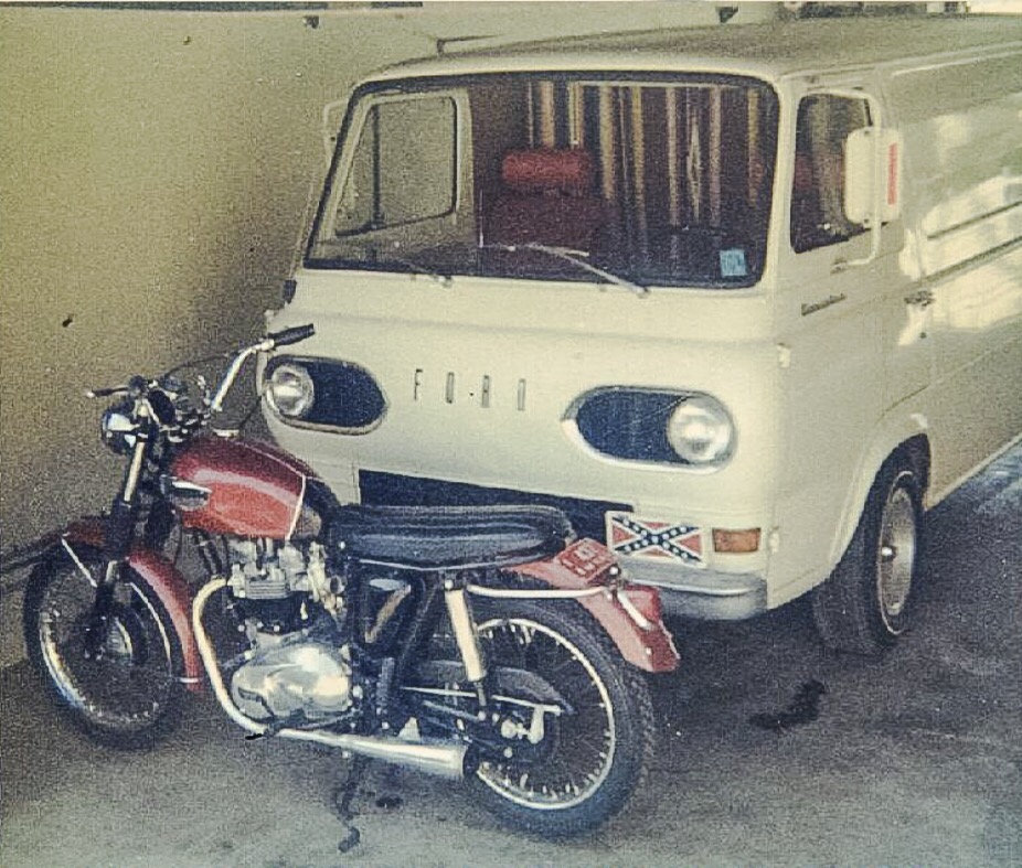 White Van – the US precursor to the Transit: Ford Econoline. Ideal road trip conveyance in which you could haul your Moto to SoCal for the winter and enjoy the surf whilst basing yourself on the road. Nice immaculate late 60’s Bonnie too.