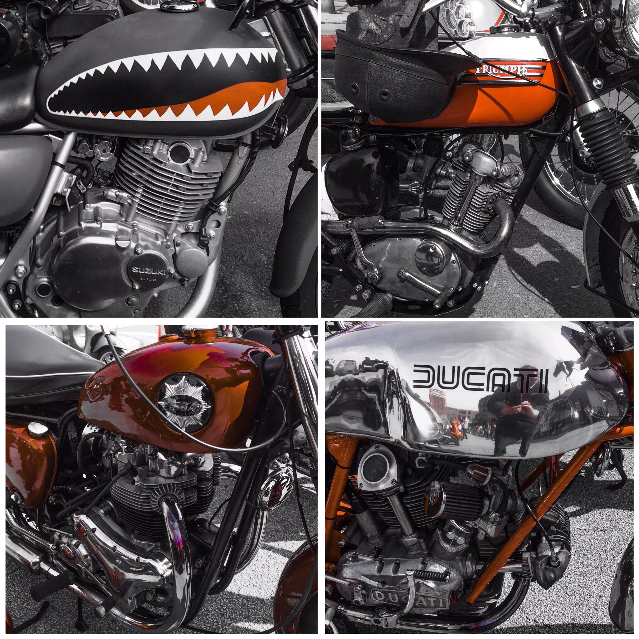 Black ‘n’ White & Red all over – more goodies spied at the weekend. A one lunged shark motif Suzuki grimacing down the road. The half century patina on an original complete Triumph Cub. The beautiful lines of a BSA A10 with stacked rifle emblem on the three cornered timing cover. And the L-twin Ducati which in this case included a bevel drive sight glass, polished tank completed the cafe style.
