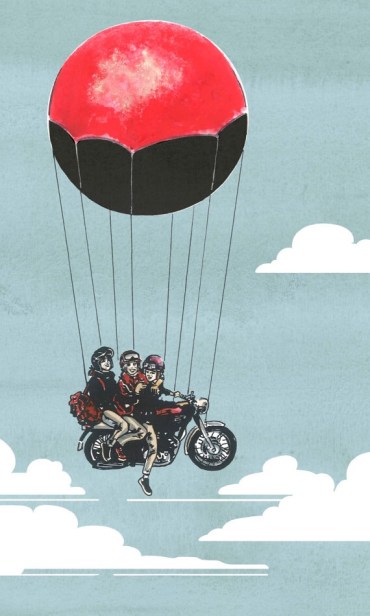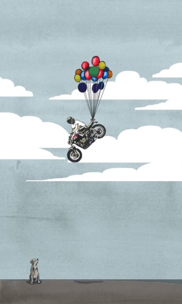 Balloon Bonneville – around the world on Triumph wheels. Etsy Artist Douglas Thompson creates fun prints of travelers atop that classic British twin on the whim of the winds.
