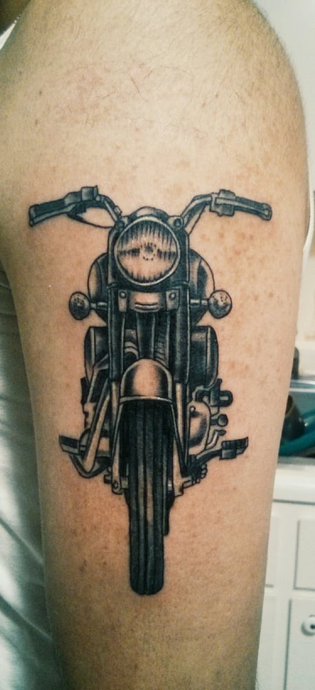 Moto Tattoo – a dedicated rider has adorned in permanent ink his upper arm with the front view of some standard motorcycle. Wonder if the other arm shoes the rear?