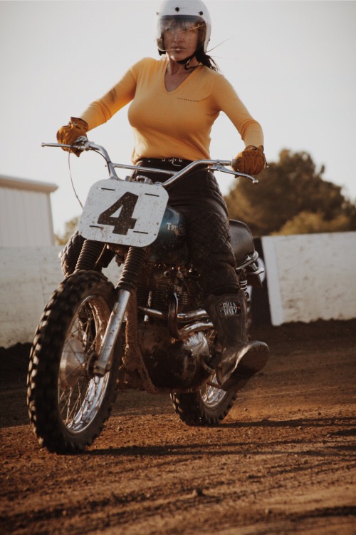 Dirt Track Doll – hittin’ the corner of an earthen oval. Big sixties Brit twin shod in rugged tires, ground clearing pipes, and wide tracker bars.