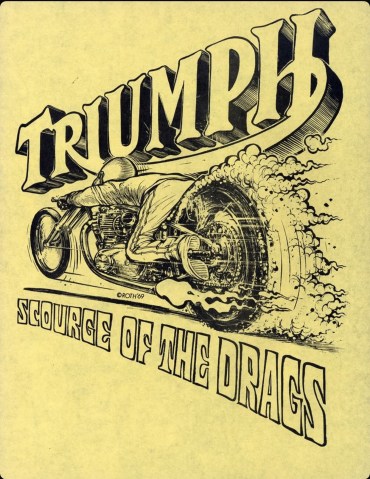 Burnin’ Rubber – classic Ed “Ratfink” Roth pen & ink illustration of a screaming Triumph drag shooting off for a sub ten second run at the strip. Great dimensional logo in speedy perspective and nice smoke detail around the fat rear tire.