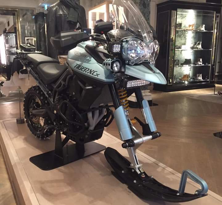 Ski Do! Some danged northern State inventive motorcycle mechanic has adapted this current model 800 Tiger into a mean snow bike. Hefty ski up front with stout damper and a sharp spiked rear tire for traction across the icy wastes of Wisconsin trails or frozen Minnesotan lakes.