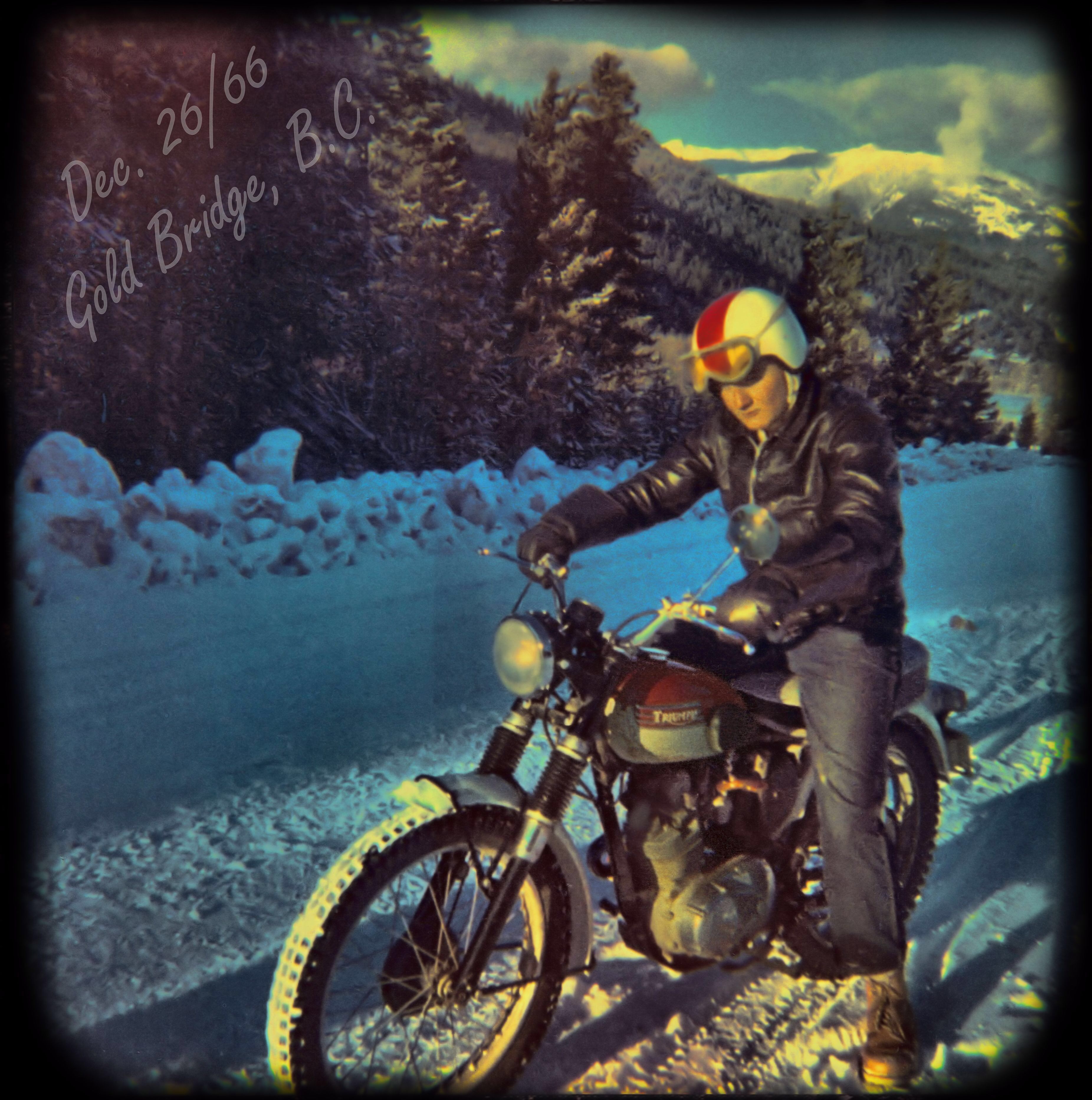 Boxing Day – what a wonderful image this is. Low Canadian sun lighting up a frozen roadway with a hardy soul taking his svelte Triumph Tiger Cub out for an icy spin. Heavy mitts keep the digits warm, but an open face helmet will cause some frost nip to the nose…