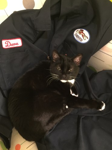 Zora – New Triumph Tiger patch added to my boiler suit. Well the kitty decided to make a bed of it. Sleepy eyed finely whiskered feline.
