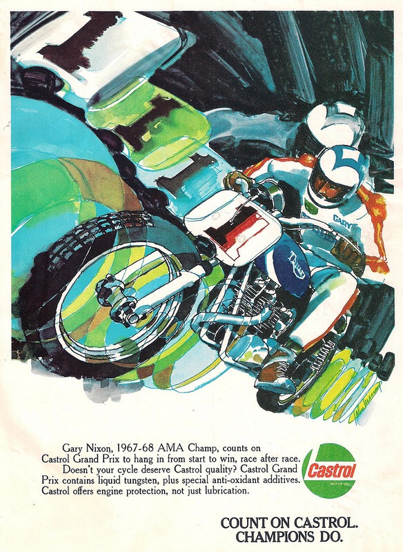 Oiler – here’s a stunning graphic advertisement from a late sixties magazine with no. 1 Gary Nixon powering his Triumph flat tracker in a somewhat psychedelic manner. Castrol
