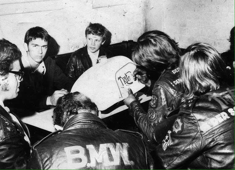 Tank Art – some cafe youth look on whilst the steadiest hand puts the finishing touches to a mammoth tank for their Triumph Norton hybrid.