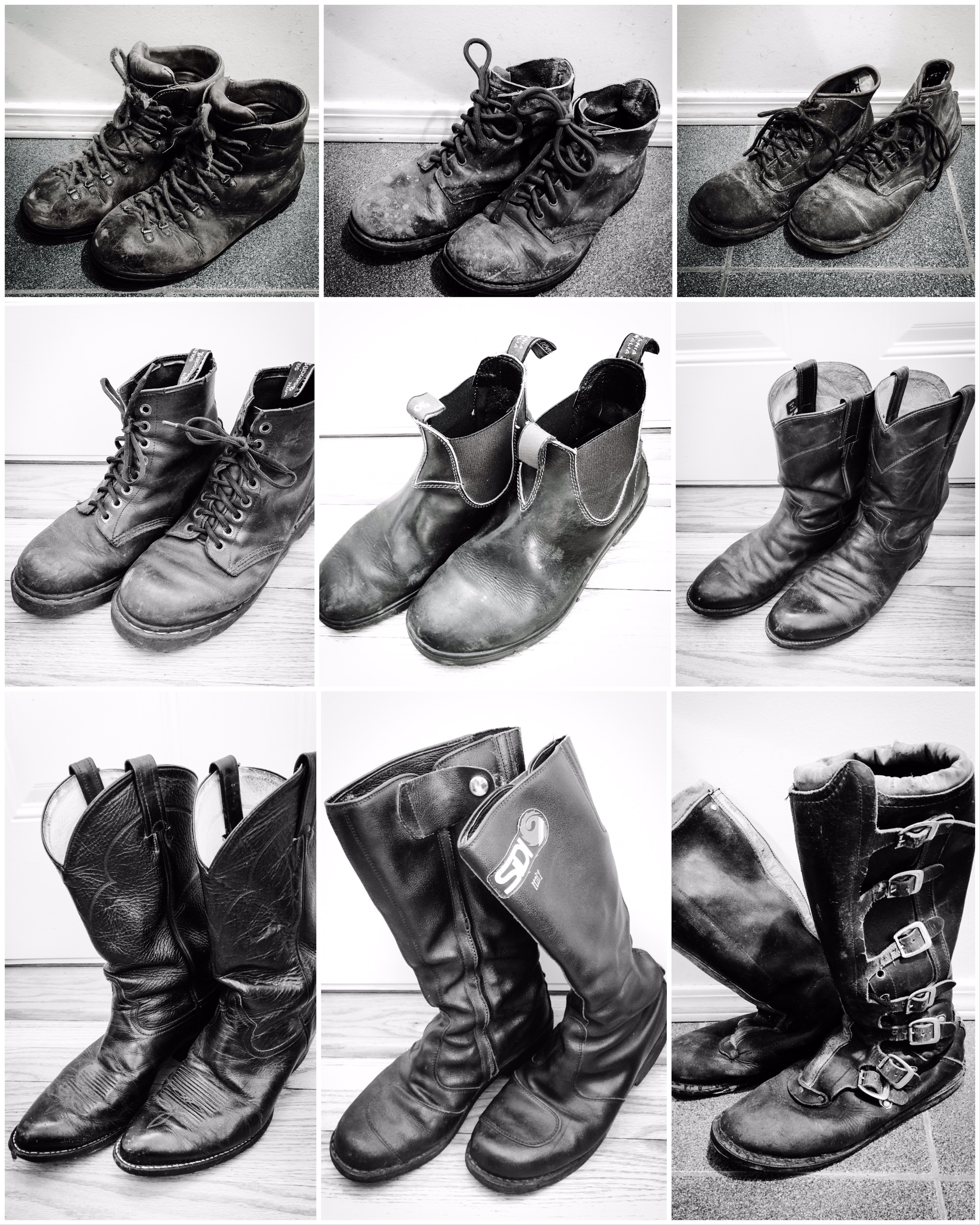 Boots – sturdy footwear for feet that get stuff done. I need by boots to be supportive, comfortable, enduring, and good looking; in that order. Here are a few of past and present pairs I use for everyday wear as well as specialized utility. Top to bottom, left to right.