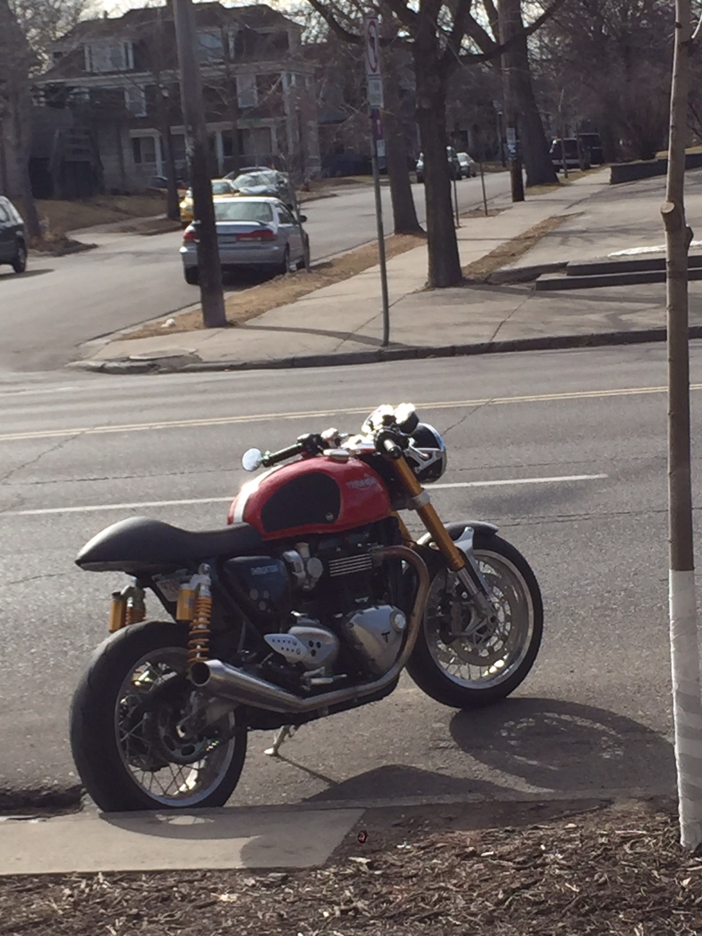 Bell ‘n’ Whistles – my nephew Marcus saw this beaut in Minneapolis earlier today. So being a diligent blogger assistant captured a photo… Thruxton with all the goodies. In red too. Lovely.